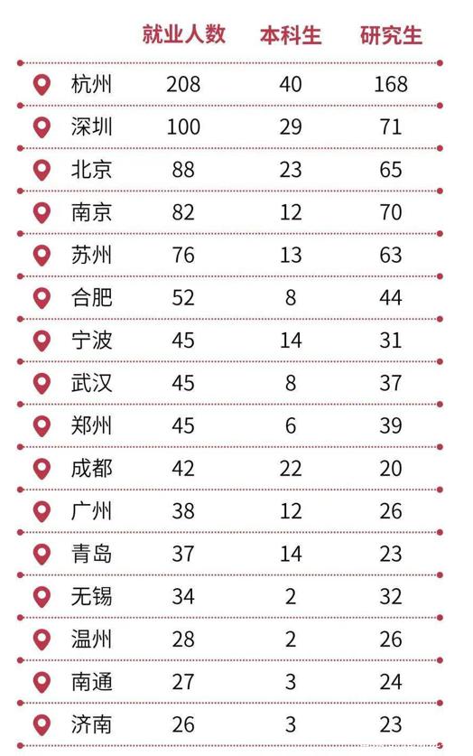 上海大学毕业生就业首选地是经济高度发达的长三角地区,其中选择在上海就业的人数最多,达到3707人,占就业总人数的73.12%。除上海外,就业人数较多的城市为杭州,达到208人,与选择上海的差距巨大。由于在上海生活成本很高,毕业生选择留在上海的比例是同比下降的,2019届本科生留上海的比例是82.41%